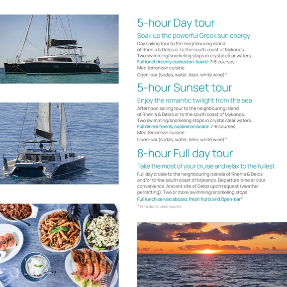 5-hour Sunset tour.Enjoy the romantic twilight from the sea.Afternoon sailing tour to the neighbouring island of Rhenia & Delos or to the south coast of mykonos.Two swimming/snorkeling stops in crystal clear waters.Full dinner freshly cooked on board: 7-8 courses, Mediterranean cuisine.Open-bar (Sodas,water,beer,white wine).