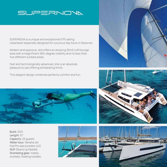 Is a unigue and exceptional 57ft sailing catamaran especially designed for luxurious day tours in Mykonos.