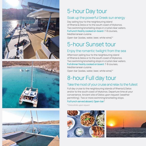 5-hour Sunset tour.Enjoy the romantic twilight from the sea.Afternoon sailing tour to the neighbouring island of Rhenia & Delos or to the south coast of mykonos.Two swimming/snorkeling stops in crystal clear waters.Full dinner freshly cooked on board: 7-8 courses, Mediterranean cuisine.Open-bar (Sodas,water,beer,white wine).